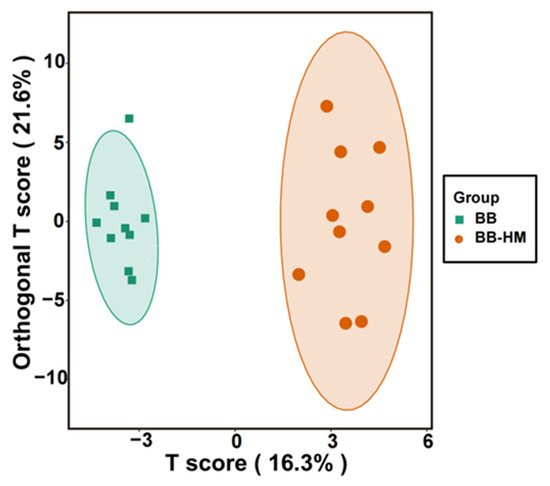 OPLS-DA score map of the rhizosphere soil of bayberry with accompanying ryegrass treatment. BB-HM denotes bayberry and ryegrass co-cultivation; BB indicates bayberry without a cover crop.