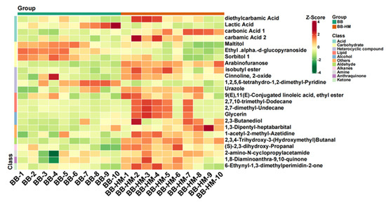 In order to observe pattern changes in metabolite content, those with statistically significant differences were normalized, and the resulting clustering heat map was drawn. Here, metabolites with a p < 0.05 and a VIP ≥ 1.0 were regarded as significant differential metabolites. The contents of 24 metabolites significantly (p < 0.05) differed between the BB and BB-HM bayberry, with a 3.83%–144.36% increment in 19 metabolites and a 23.78%–51.79% reduction in 5 metabolites of the BB-HM bayberry (Figure 5). Results indicated that the main intermediates were significantly different between BB and BB-HM bayberry rhizosphere soils. Indeed, the contents of 1,3-Dipentyl-heptabarbital and carbonic acid 1 in the BB-HM tree rhizosphere soil were 144.36% and 139.92% higher than those of the BB trees, respectively. Conversely, the relative contents of carbohydrate (sorbitol 1, maltitol, etc.) in BB-HM bayberry rhizosphere soil decreased significantly compared with the BB bayberry rhizosphere soil. Notably, a significant reduction in lactic acid content was recorded (Figure 5), probably due to an increase in soil gas permeability by accompanying ryegrass, which reduces bayberry root anaerobic respiration, hence preventing its rot [23]. Hence, the results suggested that planting accompanying ryegrass may increase soil permeability, reducing bayberry root anaerobic respiration and thereby preventing its rot.