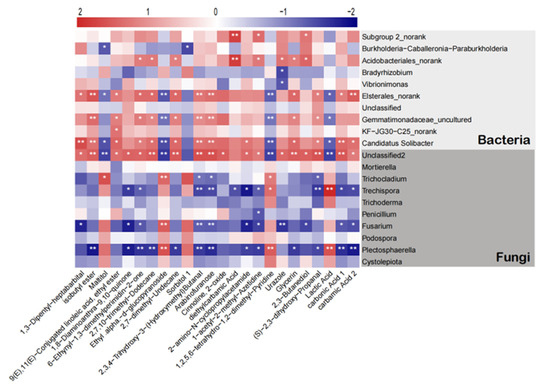 Heatmap correlation analysis between the microorganism relative abundance at the genus level and the metabolite relative contents. * and ** indicates a significant correlation at p < 0.05 and p < 0.01, respectively. The depth of the red and blue blocks represents the magnitude of the correlation coefficient, where the deep red color implies greater positive correlation while the deep blue implies greater negative correlation. The heatmap correlation between metabolites of bayberry and bacterial and fungi genera was generated using the Spearman correlation coefficient.