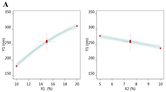 From Equation (1), it is clear that there is a positive sign in front of X1 that confirms a synergistic action between X1 and Y1 that would increase the particle size. Conversely, the negative sign in front of X2 was noticed, which characterized the antagonistic effect between X2 and Y1 where increasing X2 would diminish the particle size.