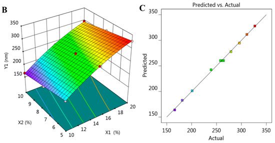 (A) All factor plot, (B) Three-dimensional response surface plot, and (C) Linear correlation plot between predicted against actual values for establishing the influence of variables X1 and X2 on the particle size response (Y1).