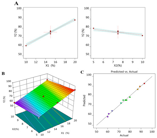 (A) All factor plot, (B) Three-dimensional response surface plot, and (C) Linear correlation plot between predicted versus actual values for illustrating the influence of variables X1 and X2 on the EE response (Y2).