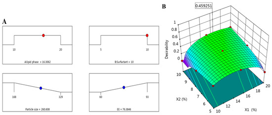 (A) Optimization ramp screening independent variable concentration, along with their expected values of responses; particle size and encapsulation efficiency, and (B) three-dimensional desirability figure illustrating the influence of X1 and X2 concentration on overall responses.