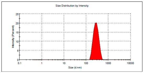 In order to obtain an optimum formulation with required characteristics, the optimization process was employed via CCD using the point prediction option. In this process, all the dependent and independent variables were adjusted toward certain required criteria to attain the selected ideal formulation. In our study, and as Table 3 shows, the independent variables X1 and X2 were adjusted to be in range while both dependent variables were oriented to minimize Y1 and maximize Y2. According to the higher desirability value, the optimized formula was selected. The optimization process came up with the proposed concentration of X1 and X2 to be 16.3% and 10%, respectively, while the expected variables for both Y1 and Y2 to be 260.59 nm and 76.38%, respectively. As per these suggestions, the anticipated formulation was fabricated and assessed for the perceived responses. Noticeably, the observed data were very close to the predicted one as Table 3 and Figure 3 exhibit. In addition, Figure 4 presents the distribution curve of the optimized DP-NLC preparation as obtained in the experimental result of the particle size (266.9 ± 3.99) nm.