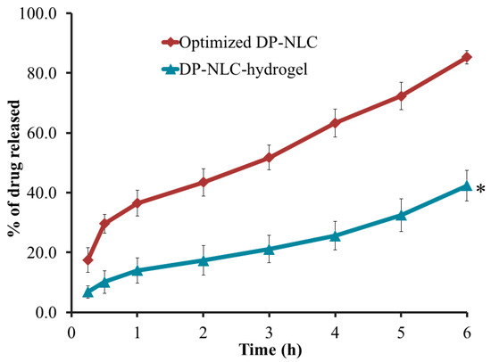 In vitro release of DP from optimized NLC and NLC-hydrogel formulation in phosphate buffer pH 5.5 at 32 °C ± 0.5. Results are shown as mean ± SD (n = 3). * p < 0.05 compared to DP-NLC formulation.