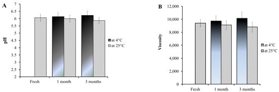 The stability test is very important in pharmaceutical manufacturing for determining the optimum storage conditions [41]. In the current investigation, stability testing was employed for the prepared DP-NLC-hydrogel compared to the same formulation while fresh, following storage for 3 months at two conditions. As Figure 6 shows, for all estimated parameters, comprising pH, viscosity, spreadability, and extrudability, non-significant changes were detected for the whole period of storage (p < 0.5). The obtained findings established that the DP-NLC-hydrogel exhibited good stability, which ensures the proficiency of the NLC-hydrogel as a nanocarrier for delivering different active compounds [42]. Moreover, the result emphasized the considerable stability of the NLC formulation owing to its structure as a lipid base shielded with surfactant [43].