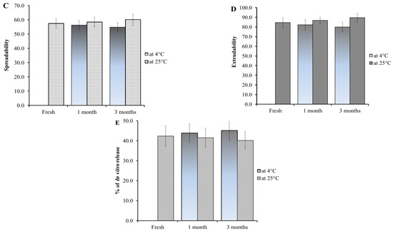 Stability profile of DP-NLC-hydrogel formulation following storage for 1 and 3 months at 4 °C and 25 °C relative to (A) pH, (B) viscosity, (C) spreadability, (D) extrudability, and (E) % of in vitro drug release compared to same formulation while fresh.
