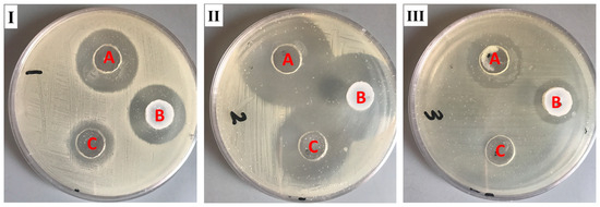 Zone of inhibition caused by the examined formulations. (A) DP-NLC-hydrogel, (B) FA cream (fucidin®), and (C) Blank NLC-hydrogel on different bacteria: (I) Bacillus subtilis, (II) Staphylococcus aureus, and (III) klebsiella pneumoniae.