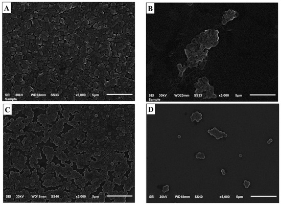 SEM images displaying the pattern of the bacterial biofilms formed following 24 h of incubation and its inhibition. (A) Control Klebsiella pneumoniae, (B) Klebsiella pneumoniae treated with DP-NLC-hydrogel, (C) Control staphylococcus aureus, and (D) Staphylococcus aureus treated with DP-NLC-hydrogel.