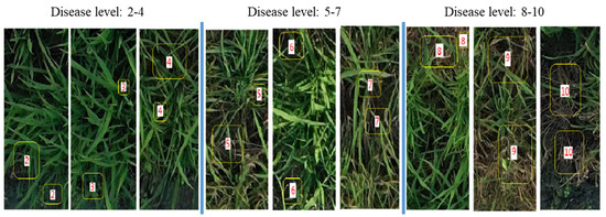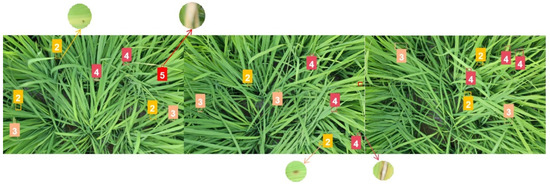 The disease levels of rice blast is determined according to the standards of the International Rice Research Institute’s (IRRI) [23], as shown in Table 1. The typical levels of rice blast is shown in Figure 2. Generally, when the disease level is 1, it indicates that it is healthy and does not need to be labeled. When the disease level reaches 9, the leaf surface will turn yellow. It will die when the disease level reaches 10.