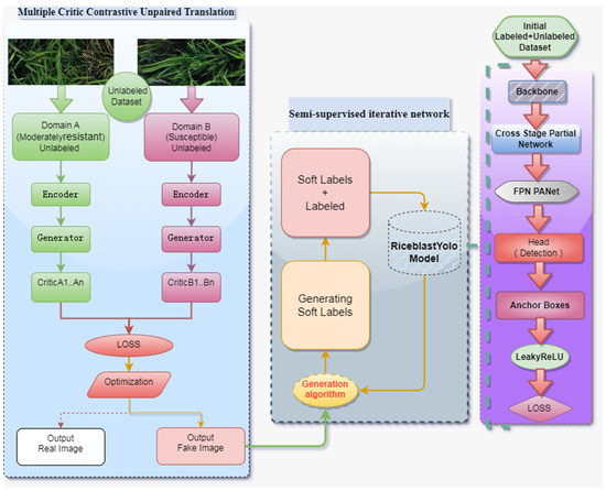 The semi-supervised contrastive unsupervised transformation iterative network model for early detection of rice blast (Figure 3) combines the advantages of semi-supervised learning and utilizes unlabeled image data for training. It also incorporates the contrastive unsupervised transformation technique to achieve image transformation and augmentation across different domains, thereby improving the generalization capability and precision of the model. The precision here refers to the ratio of the number of samples correctly classified by the model to the total number of samples, usually expressed as a percentage. It measures the proportion of samples correctly classified by the model in the entire dataset. An efficient single-stage object detection model was initially used for rice blast detection [24]. This model, called RiceblastYolo, consists of Backbone, Feature Pyramid Network (FPN), Detect Header, Anchor Boxes, activation functions and loss functions [25,26,27,28]. RiceblastYolo is an adaptation of the YOLO framework, tailored to meet the requirements for early detection of rice blast. It excels in the rapid and precise detection of rice blast, making it particularly suitable for extensive image monitoring tasks. Moreover, this method employs semi-supervised learning techniques to enhance the performance of the model, which not only utilizes labeled data but also handles unlabeled data by generating synthetic labels to augment the training dataset. This innovation significantly improves the accuracy and automation of rice blast detection. Furthermore, RiceblastYolo incorporates the use of generative adversarial network (GAN) technology to make the model better adapt to various image variations, consequently elevating the accuracy and robustness of detection.