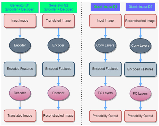 Here, G1 is responsible for transforming the input image and generating the translated image, while G2 is responsible for reconstructing the translated image. D1 is used to discriminate the authenticity of the input image, while D2 is used to discriminate the authenticity of the reconstructed image. Specifically, G1 consists of an encoder and a decoder, which encode the input image to extract image features and then decode it to generate the translated image. Similarly, G2 also consists of an encoder and a decoder, which encode the translated image to extract image features and then decode it to generate the reconstructed image. Both D1 and D2 include convolutional layers and fully connected layers, so that they can discriminate the features of the input or reconstructed images and output the probability results.