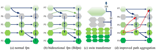 Four kinds of FPNs: (a) Normal FPN; (b) Bidirectional FPN (Bifpn); (c) Swin Transformer; (d) Improved Path Aggregation (improved Pafpn). The red dot line represent the additional bottom-up pathway.