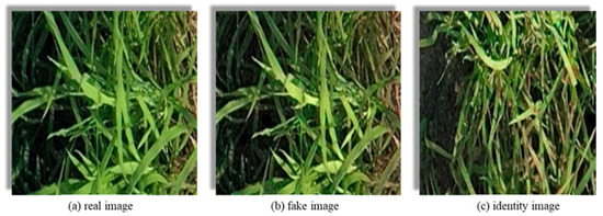 The three types of images generated by the generator are as follows: (a) real image: served as the reference for comparison; (b) fake image: synthesized target domain images generated by the generator in accordance with the input images of the source domain; (c) identity image: the generator takes real images from the target domain as input and attempts to preserve the content of the image in the generated output.