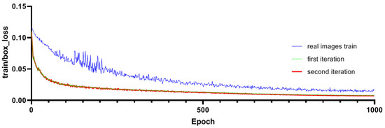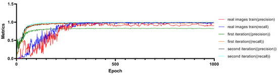 The improved Pafpn model undergoes two iterations of training, as shown in Figure 9, and the training gradients show a consistent and smooth descent. The minimum gradient loss of the detection bounding boxes for the first iteration is 0.00782, while for the second iteration, it is 0.00702. The loss function curve tends to converge after 900 steps. It is important to note that during training with real images, the minimum loss reached was 0.00736. This smooth descent indicates that the model has good convergence during the training process. To evaluate the performance of the model, we adopt the F1 score, which combines precision and recall by calculating their harmonic mean to strike a balance between the two aspects. The detection precision and recall rate of the model after two iterations are displayed in Figure 10. As shown in Figure 10, the detection recall of the first iteration was 0.824, and that of the second iteration was significantly improved to 0.991. Additionally, the highest recall rate in the first iteration was 0.968, and that in the second iteration achieved a perfect 1.0. It is important to note that during training with real images, the recall value was 0.982. This underscores the advantages of the second iteration in terms of detection performance, especially when compared to training with real images.