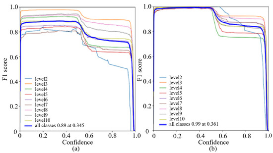 Eight levels of rice blast infections are tested in each model. In this paper, the data are classified into the training set, validation set, and test set. The training set does not contain the test set. The validation set is taken from the training set, but it is not involved in the training. Such a data division can evaluate the model objectively [33]. One hundred images are randomly selected from the dataset as the test set, and then the test results of the improved method will be compared with those of other techniques. According to Formulas (12)–(14), three indicators, that is, precision, recall and F1, are obtained through multiple controlled experiments to measure the effectiveness of the model in rice blast detection.