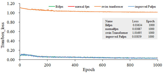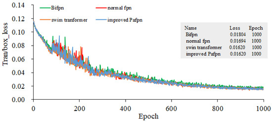 In all methods, YOLOv5l pre-trained weights are used to train three GPUs, and the training batch size is 21. Stochastic gradient descent (SGD) is used to conduct the train over 1000 epochs. When the initial learning rate is set as 10−3, the weight decay is 5 × 10−4, the momentum is 0.937, and the anchor scale is multiplied by 4/3. All experiments were conducted using three Tesla V100 GPUs sourced from NVIDIA, headquartered in Santa Clara, California, United States. Annotated rice blast data and unlabeled data are used to conduct the joint training. The input image size for our model is 401 × 176, and the data split ratio for the training set, validation set, and test set is 5:4:1. Four types of FPNs are served as the feature extraction backbone networks. The training gradients for object localization, as presented in Figure 12 and Figure 13, illustrate the bounding box gradients. Figure 14 provides an overview of the model’s precision. It can be concluded from Figure 12 that the Bifpn model exhibits the best object localization capability. Its gradient loss value is 0.03634, which is lower than that of other FPN models. Similarly, as shown in Figure 13, the model using improved Pafpn achieves a gradient loss value of 0.01620 for bounding box localization, which is lower than the other FPN models. Additionally, Figure 14 demonstrates that the model using improved Pafpn attains the highest precision value of 0.96724.