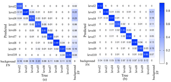 Images from a low-altitude unmanned aerial vehicle (UAV) are collected at a flight height of 2.5 m. Fake images are generated by using the CUT model with dual discriminators and dual generators, and the soft label generation algorithm is applied to obtain high-quality soft labels. Then, these soft label data are input into RiceblastYolo for iterative training, so as to continuously improve the precision of rice blast recognition. Figure 15 displays the confusion matrices of the first and second training iterations for different levels of rice blast infection. It can be observed that in the first iteration shown in Figure 15a, the detection precision for rice blast at level 2 is only 68%. However, in the second iteration shown in Figure 15b, the detection precision for rice blast at levels 2–4 exceeds 90%. This indicates that the proposed method achieves satisfactory performance in early detection of rice blast. As levels 2–4 represent early rice blast with less obvious symptoms, it further demonstrates the effectiveness of the proposed method in early detection of rice blast.