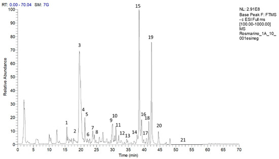 Chromatogram of compounds in the methanolic extract of the rosemary “Eretto Liguria” ecotype. Peak data are shown in Table 1. The peaks of the identified metabolites are annotated with numbers. Key: 1: caffeic acid; 2: isorhamnetin–3–O-hexoside; 3: apigenin–7–O–glucoside; 4: homoplantaginin; 5: dihydrorabdosiin; 6: rosmarinic acid; 7: rabdosiin; 8: isorhamnetin; 9: rosmanol isomer; 10: rosmanol isomer/epirosmanol; 11: rosmanol isomer; 12: rosmarinic acid isomer; 13: rosmanol isomer; 14: hydroxy–octadecatrienoic acid; 15: carnosol; 16: rosmadial; 17: rosmadial isomer; 18: hydroxy–octadecadienoic acid; 19: carnosic acid; 20: methyl carnosate; 21: oleanolic acid.