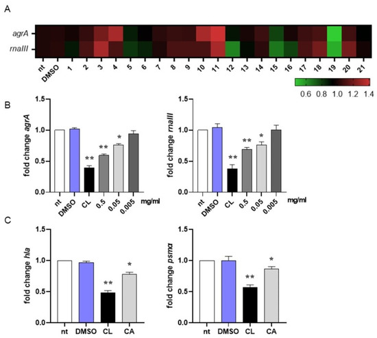 Interference in quorum sensing signaling of MRSA. (A) Heatmap illustrating differential gene expression over non-treated (nt) controls. MRSA cultures (106 CFU/mL) were incubated at 37 °C for 16 h with the isolated compounds (0.5 mg/mL) reported in Table 1 or vehicle (DMSO 0.05% v/v). RNA was extracted and subjected to qRT-PCR to evaluate agrA and rnaIII gene expression. Expression values for each gene were normalized to the expression of the housekeeping gene gyrB and reported as fold change over non-treated (nt) samples. Increased gene expression is reported in red, and reduced gene expression is reported in green (color scale at bottom). Data were obtained from three independent experiments, each performed in duplicate. See Table 1 for sample identification. (B) MRSA cultures (106 CFU/mL) were incubated at 37 °C for 16 h with carnosic acid (CA) at 0.5, 0.05, and 0.005 mg/mL or 0.25 µg/mL clindamycin (CL). Expression of agrA and rnaIII genes was assessed by qRT-PCR and normalized to the expression of the housekeeping gene gyrB. Data are reported as mean ± st err of three independent experiments, each performed in triplicate, and calculated as fold change relative to gene expression in non-treated (nt) samples. (C) MRSA cultures (106 CFU/mL) were incubated at 37 °C for 16 h with CA at 0.05 mg/mL or 0.25 µg/mL clindamycin (CL). Expression of hla and psmα genes was assessed by qRT-PCR and normalized to the expression of the housekeeping gene gyrB. Data are reported as mean ± st. err. of three independent experiments, each performed in triplicate, and calculated as fold change relative to gene expression in non-treated (nt) samples. * denotes p < 0.05 vs. nt; ** denotes p < 0.02 vs. nt.