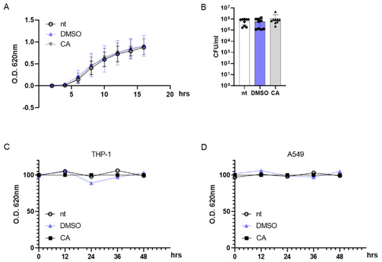Carnosic acid (CA) exerts no effect on prokaryotic and eukaryotic cells. (A) MRSA (106 CFU/mL) cultures were incubated at 37 °C with DMSO (0.05% v/v), CA (0.05 mg/mL), or were left untreated (nt). The growth kinetics were recorded for 16 h at 620 nm. (B) At the end of the incubation reported in (A), bacterial cultures were diluted and plated on agar media. Plates were incubated for 16 h at 37 °C and colonies were counted. (C,D) THP-1 and A549 cell lines were incubated with DMSO (0.05% v/v), CA (0.05 mg/mL), or were left untreated and cell viability was assessed by MTT assay at 0, 12, 24, 36, and 48 h. Data are reported as mean ± st err of three independent experiments, each performed in triplicate.