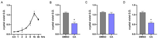 Anti-biofilm agents could act by interfering with biofilm formation or disrupting already mature biofilm. Considering the data reported in Figure 4A, MRSA cultures were immediately treated with CA at 0.05 mg/mL to assess the interference with biofilm formation (Figure 4B) or incubated with CA 8 h after the beginning of the culture to verify the disrupting effect (Figure 4C). Biofilms were assessed following 16 h of incubation. As reported in Figure 4B, incubation with CA starting from the beginning of the culture significantly prevented biofilm formation, whereas the addition of CA after 8 h of culture did not alter the already formed biofilm (Figure 4C). The effects of CA in preventing biofilm formation were also demonstrated with non-antibiotic-resistant S. aureus (Figure 4D).