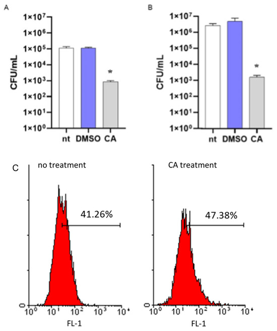 To assess the role of CA in increasing the susceptibility of MRSA to intracellular killing, a mechanism of antibacterial immune defense in the host, we incubated bacteria with CA at 0.05 mg/mL or DMSO. After 16 h incubation, bacterial cultures were washed by centrifugation and incubated with differentiated THP-1 cells for 1 h to allow phagocytosis. Then, cells were washed, incubated with antibiotics to remove extracellular bacteria, and lysed. Intracellular bacteria were enumerated by seeding the samples in agar plates. As reported in Figure 5, MRSA cultures incubated with CA showed a reduced number of bacterial colonies as compared with cultures incubated with DMSO, thus demonstrating the ability of CA to reduce the survival of MRSA in the phagolysosomes of macrophage-like cells. The same data were obtained considering non-antibiotic-resistant S. aureus (Figure 5B). We performed a standard assay for phagocytosis to exclude any anti-inflammatory effects of CA in reducing the phagocytic activity of THP-1 cells. Latex fluorescent beads were incubated with or without CA, washed, and cultured with THP-1 cells as described for MRSA. Phagocyted beads were determined by flow cytometry analysis. As reported in Figure 5C, fluorescent signals related to phagocyted beads were comparable in THP-1 cells incubated with beads treated or not with CA.
