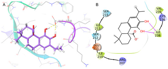 Binding pose (A) and interactions (B) of carnosic acid (CA) at the conserved AgrA active site. (A) The protein is reported as green-purple ribbons; the ligand is reported as purple capped sticks; H-bonds are presented as yellow dotted lines. (B) The ligand is surrounded by the protein residues represented as follows: the negatively charged residues are indicated in red, polar residues are in cyan, and hydrophobic residues are shown in green. H-bonds are depicted as purple arrows.
