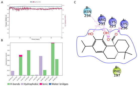 Molecular dynamics simulation results. (A) Root-mean-square deviation (RMSD) plot for the carnosic acid (CA)/AgrA complex along 100 ns molecular dynamics simulation related to Cα positions of residues belonging to the protein backbone (blue) and the ligand (purple). (B) Protein–ligand interactions (or ‘contacts’) plot for the CA/AgrA complex along 100 ns molecular dynamics simulation. Contacts are categorized into four types: hydrogen bonds, hydrophobic interactions, ionic bonds, and water bridges. (C) Ligand–atom interactions with the protein residues on chain A (Lys223 and Lys236) and on chain B (Arg233 and Asn234). Interactions that occurred more than 30.0% of the simulation time in the selected trajectory (0.00 through 100.00 ns) are shown.