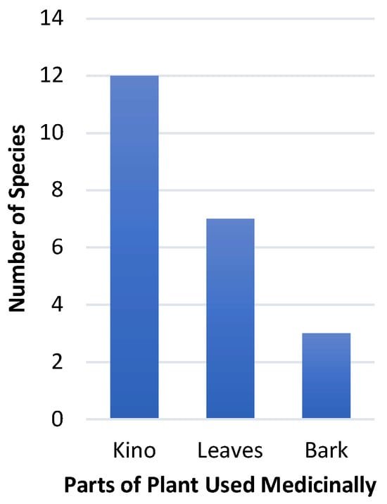 The ethnopharmacological data for the Corymbia genus presented in Table 1 show that of the 115 species known, ethnomedical uses have only been reported for 14 of these species. Of those 14 species, the kino was used medicinally in 12 spp., followed by the leaves (7 spp.) and bark (3 spp., Figure 1).