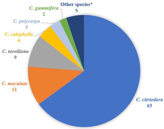 A comparison of the number of research articles reported on Corymbia species. Other species* refers to C. blesseri, C. eximia, C. intermedia, C. papuana, C. terminalis and C. tessellaris which had one reference each. No publications were reported for C. dichromophloia and C. opaca (excluding ethnomedical uses).