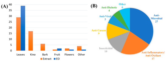 The number of references reported for ethnomedically significant Corymbia species, analysed according to (A) plant part studied and (B) biological activities investigated.