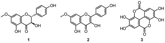 Extracts of C. citriodora have been studied to a lesser degree than leaf EOs, but they have been shown to possess anti-fungal activity. The petroleum ether leaf extract of C. citriodora has been shown to possess moderate inhibitory and fungicidal activity against A. flavus and A. parasiticus [58]. Compounds, including 7-O-methylaromadendrin 1, 7-O-methylkaempferol 2 and ellagic acid 3, isolated from the kino of C. citriodora (Figure 4) have also been shown to have varying anti-fungal activities against P. notatum, A. niger and F. oxysporium [54].