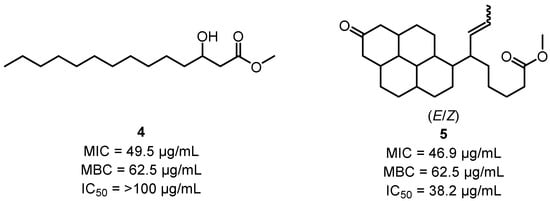 Anti-tuberculosis activity of hydroxymyristic acid methyl ester 4 and methyl (E)- and (Z)-6-(8-oxooctadecahydrochrysen-1-yl)non-7-enoate 5 against M. tuberculosis H37RvATCC 27294 [115].
