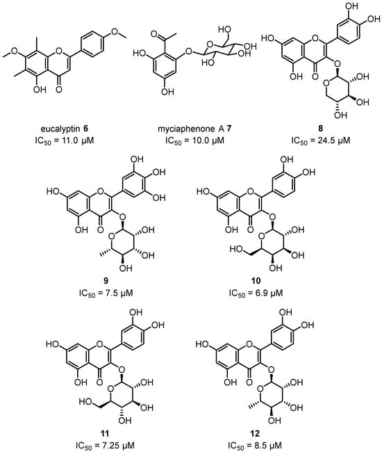 Crude extracts and one isolated compound from the leaves of C. maculata showed inhibitory activity against T. brucei [101]. Eucalyptin 6, myciaphenone A 7 and flavonoid glycosides 8–12 (Figure 6) isolated from the leaves of C. torelliana have also shown potent anti-leishmanial activity against L. donovani [96]. A comprehensive study of the biological activities of over 100 flavonoids and polyphenols against Leishmania donovani, Trypanosoma brucei rhodesiense and Trypanosoma cruzi has been previously reported; however, despite these efforts, clear quantitative structure–activity relationships (SARs) could not be established [158]. More recent work has shown that various flavonoid glycosides, including quercetin-3-O-β-D-galactoside 10, inhibit Leishmania amazonensis arginase [159], which may represent an important mode of action for the anti-protozoal activity observed in flavonoid glycosides and could be a target for further drug lead development and SAR optimisation.