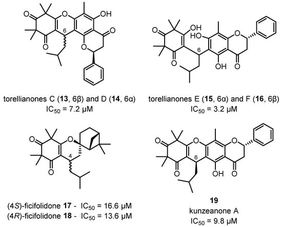 Torellianones C-F 13–16, ficifolidones 17–18 and kunzeanone A 19 isolated from the flowers of C. torelliana and their anti-plasmodial activities against P. falciparum [112].