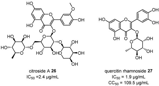 Citrioside A 26 and quercetin-3-O-α-L-rhamnoside 27 isolated from the leaves of C. citriodora and their anti-viral activities against RSV [52,53].