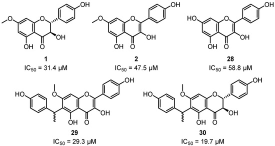 The leaf EO of C. citriodora and its constituents citronellal and 1,8-cineol have been observed to inhibit ACE2 and LOX enzymes in vitro, suggesting there are multiple anti-inflammatory modes of action [81]. Additional studies have also shown that the leaf EO and resin extracts of C. citriodora inhibit LOX-1 and 15-LOX, respectively [28,32]. Extraction and purification of the EtOAc fraction of the EtOH extract of C. citriodora kino led to the isolation of 7-O-methylaromadendrin 1, 7-O-methylkaempferol 2 and flavonoids 28–30 (Figure 11), which were also shown to inhibit 15-LOX [49].