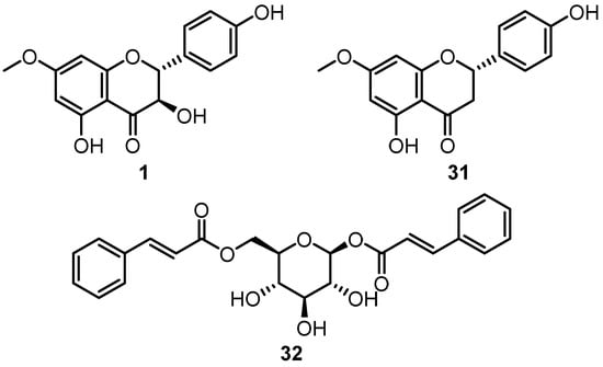 The kino of C. maculata has also garnered some attention for its anti-inflammatory and anti-oxidant activities. The chloroform extract of the kino of C. maculata and isolated compounds 7-O-methylaromadendrin 1, sakuranetin 31 and 1,6-dicinnamoyl-O-α-D-glucoside 32 (Figure 13) were shown to protect against acetaminophen lethality in rats and significantly reduced the rise in aspartate aminotransferase, alkaline phosphatase and alanine aminotransferase levels induced by acetaminophen [99,103]. More recently, the MeOH extract of C. maculata kino was shown to reduce levels of NF-κB, TNF-α, COX-2 and NO inflammatory biomarkers and significantly reduced paw thickness in carrageenan-induced paw oedema in rats [102].