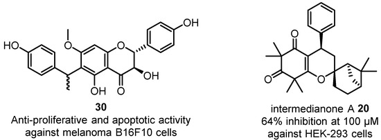 Anti-proliferative effects have been observed in the aqueous extracts of C. citriodora and C. maculata leaves against PaCa-2 cells [30]. The aqueous fraction obtained from the EtOH extract of C. citriodora kino was observed to inhibit cell growth and induce apoptosis in Hep G2 cells [41]. The EtOAc kino extract of C. citriodora and its major constituent, flavonoid 30 (Figure 14), have shown anti-proliferative activity and cytotoxicity through apoptosis induction in B16F10 melanoma cells [19,40]. Novel β-triketone-monoterpene intermedianone A 20 isolated from the flowers of C. intermedia also exhibited anti-proliferative activity against HEK-293 cells [19]. Further investigations are required to elucidate the modes of action and molecular targets of these novel anti-cancer agents.