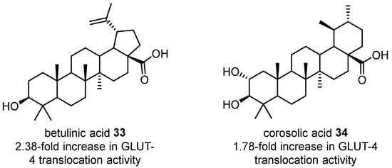 Betulinic and corosolic acids 33–34 isolated from the leaves of C. citriodora and their in vitro GLUT-4 translocation activities [51].