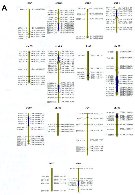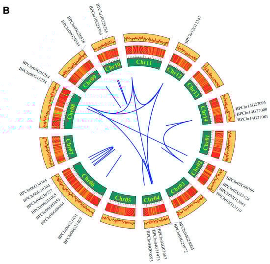 Chromosomal localization and collinearity analysis of BpbHLH family genes. (A) Distribution of BpbHLH family genes in the 14 birch chromosomes. The vertical strips represent the birch chromosomes. The chromosome number is located at the top of each chromosome. The left side of the chromosome represents the position of the gene on the chromosome, and the right side of the chromosome is the gene ID. (B) Collinearity analysis of bHLH genes in birch. The circle plot represents the chromosomes of birch, and the identified collinear genes are linked by blue lines.