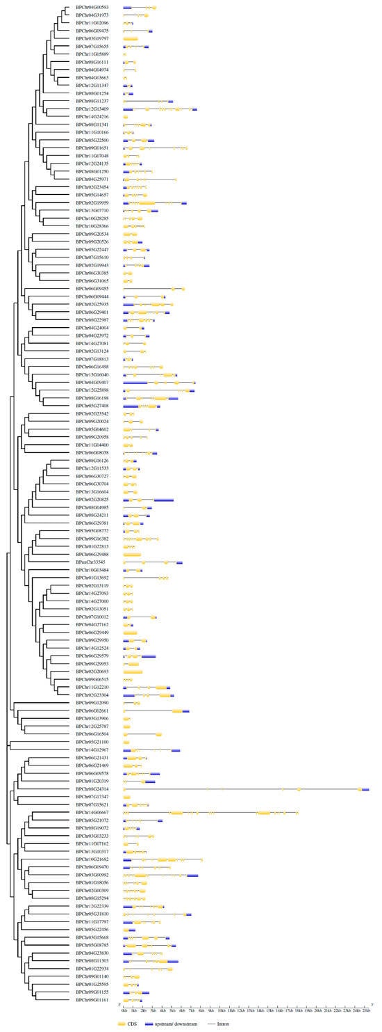 Gene structure of BpbHLH family proteins. For gene structure analysis, exons and introns are shown in yellow boxes and black solid lines, respectively. Cluster analysis was carried out according to the results of phylogeny.