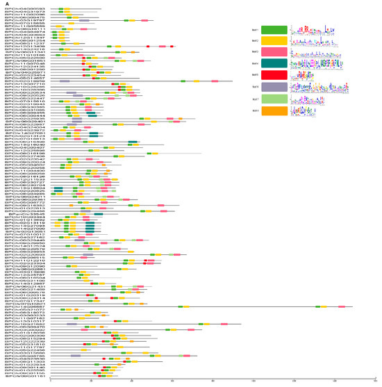 To characterize potential conserved motifs of the BpbHLH family, protein sequences of BpbHLH members were analyzed using the MEME software (http://meme-suite.org/, 13 March 2021) online. A total of eight conserved motifs (numbered 1 to 8) were identified (Figure 3A). The distribution of the important conserved motifs among BpbHLH proteins showed that members within the same group exhibited highly similar motif distributions (Figure 3A). There were 119 bHLH proteins containing the basic motif and 123 proteins containing the helix1 motif, representing highly conserved domains. Of the BpbHLH genes, 9.3% and 39.1% contained motif 3 and the helix2 motif, respectively. These results indicate the good conservation of the bHLH gene family in plant species. In addition, conserved protein motifs may contribute to their similar functions.