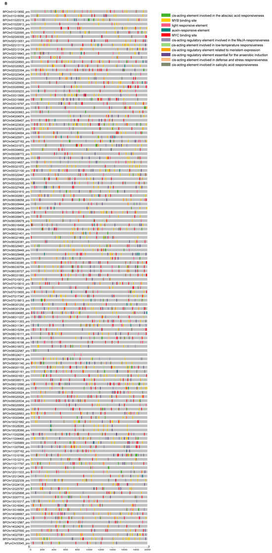 Protein motif and analysis of the cis-regulatory element in the promoter of BpbHLH family genes. (A) Analysis of protein motifs. Different motifs are displayed in boxes of different colors. (B) Prediction of cis-elements in the BpbHLH gene promoter. On the left is the gene ID, and different patterns on the right represent different cis-elements.