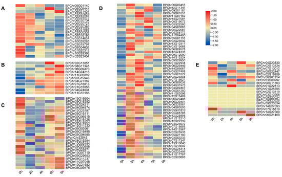 Expression profiles and gene replication events of BpbHLH family genes. The heatmap reflects the expression changes in BpbHLH genes in response to osmotic stress of whole plant for 0, 2, 4, 6, and 9 h. Red represents upregulation, and green represents downregulation. Class (A) represents genes that are downregulated under osmotic drought, Class (B) represents genes that are upregulated under osmotic drought, and Class (C) represents genes that are downregulated in early BHLH gene expression and upregulated in late BHLH gene expression during osmotic drought; Class (D) represents genes that upregulate the expression of BHLH genes in the early stage and downregulate BHLH genes in the late stage of osmotic drought, while Class (E) represents genes that do not show significant changes or responses to osmotic drought. The expression values were converted by log2. The error bar indicates the standard deviation (STD) of the three biological replicates (p < 0.05).