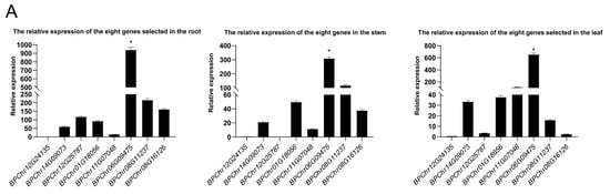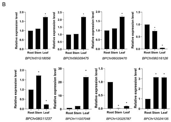 Expression of eight selected bHLH genes in different tissues of birch. Tissues from 3-month-old plants were used for the analysis. The relative expression of BPChr12G24135 in different tissues of birch was set as 1 to normalize its expression in other tissues. (A) The relative expression of eight selected bHLH genes in the roots, stems, and leaves of birch. (B) The relative expression level of eight different genes in the roots was set to 1 to normalize the expression of other genes in the stems and leaves. The relative expression levels of the eight selected genes in the roots, stems, and leaves. The expression value is 2−ΔΔt. The error bar indicates the standard deviation (STD) of the three biological replicates. The asterisk (*) represents significant difference compared with BPChr12G24135 (p < 0.05).