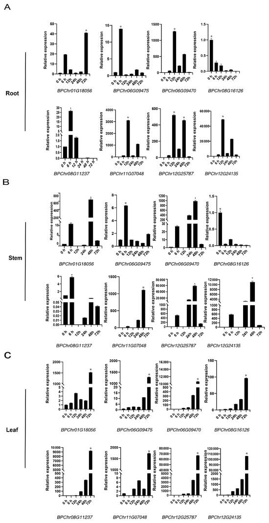 To screen the key BpbHLH genes in response to osmotic stress and explore the tissue response patterns of eight BpbHLH genes under PEG6000 treatment, the expression patterns of the eight genes in response to osmotic stresses in roots, stems, and leaves were investigated using qRT-PCR (Figure 6). Under PEG6000 treatment, all eight genes had the earliest expression in roots. Among them, BPChr06G09475, BPChr08G11237, and BPChr01G18056 responded significantly at 6 h of treatment. The eight BpbHLH genes responded relatively late in the leaves, reaching their peak expression at 72 h of treatment, and the expression levels were significantly upregulated (the expression can reach tens of thousands of times compared to the controls), suggesting that the eight genes play a crucial role in the osmotic resistance process of birch leaves. BPChr12G24135, BPChr06G09470, BPChr11G07048, and BPChr12G25787 were the most significantly upregulated genes in all three tissues after treatment, with BPChr06G09470, BPChr11G07048, and BPChr12G25787 being the genes with relatively moderate expression levels in the three tissues and BPChr12G24135 being the genes with relatively lowest expression levels in the three tissues prior to treatment (Figure 5). The results showed the important role of BPChr06G09470, BPChr11G07048, and BPChr12G25787 in the development of birch roots, stems, and leaves and their response to osmotic. As the gene with the highest relative expression in the three tissues, BPChr06G09475 has a lower response to stress in roots and stems than other genes, except in leaves. Its role in the response of birch leaves to drought is worth exploring. As the only one selected from the Group II gene, BPChr08G16126 was significantly downregulated in roots and stems under stress treatment, indicating its functional specificity.