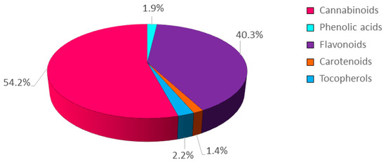The inflorescences of hemp plants treated with CHT solutions at two different concentrations (50 mg/L and 250 mg/L), each at three different MWs (low, L; medium, M; high, H), were analyzed for their total phenolic content (TPC), total flavonoid content (TFC), and total antioxidant activity, determined spectrophotometrically, and their content of secondary metabolites, determined by HPLC. The complete analytical data are summarized in Figure 1 and Table S1. Regarding the average abundance of the different classes of secondary metabolites detected, cannabinoids were the most represented (54.2%), followed by flavonoids (40.3%), tocopherols (2.2%), phenolic acids (1.9%), and carotenoids (1.4%) (Figure 1).
