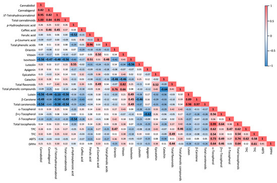 Pearson’s correlation coefficients for all pairs of traits analyzed in the inflorescences of the hemp cv. Codimono. Correlations significant at p ≤ 0.05 are highlighted in bold. TPC, total phenolic content; TFC, total flavonoid content; ABTS, 2,2-azinobis-(3-ethylbenzothiazoline-6-sulphonic acid) radical scavenging activity; DPPH, 2,2-diphenyl-1-picrylhydrazyl radical scavenging activity.